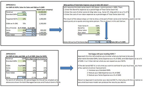 This tool can be used to perform an informal benchmark on your solution provider business as it is, since the "stoplighting" controls will indicate by color which aspects of the business are at best-in-class levels. It can then be used to test "what-if" scenarios for evolving the business model or improving poor performing factors in your revenue and cost model to see what best-in-class performance would deliver.