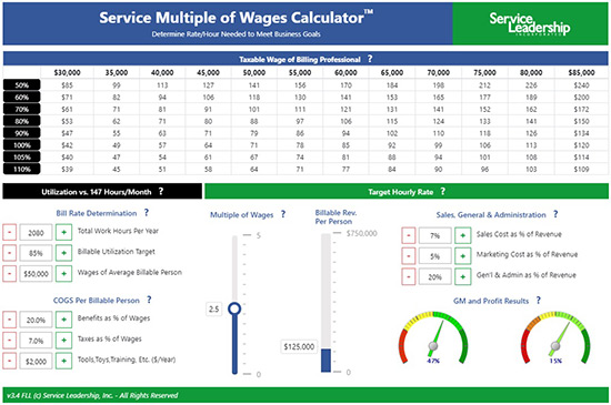 An effective "safety net" that can prevent costly pricing mistakes and dispel dangerous pricing notions, this calculator is easy to use and most helpful in running "what if" scenarios to test service profits and set service pricing. Premised on the best-in-class formula of generating revenue per person of 2.5 times their W-2 wages, the calculator will help your run scenarios around changes to the variables that ultimately impact EBITDA.