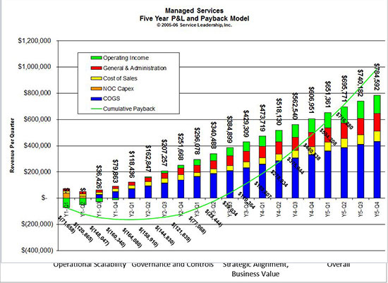 Proper planning is important for a new service offering to have the best chance of attaining best-in-class growth, service quality and profit. This tool helps you (1) understand how many deals you will have to sell, and at what price and COGS, in what period of time; (2) make sure the new offering is cross-sellable to your Target Customer Profile; and (3) that the shareholders have approved the offer, the investment and ROI curve.